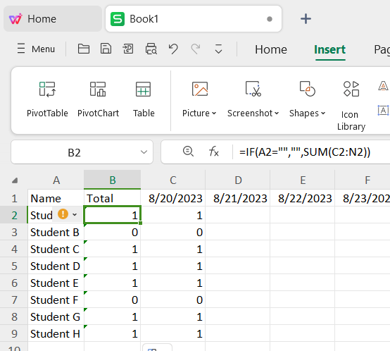 Instead of the far right, position the total attendance tally beside each student's name. Right-click column B, choose "Insert," and label it as "Total."