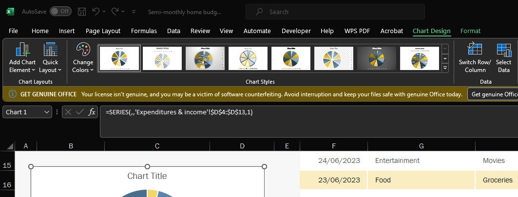 Use the options in the "Design" and "Layout" tabs to add a title and labels to your chart.