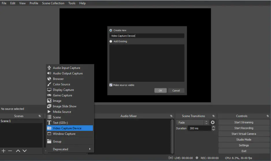 Select Display Capture to record your full screen or Window Capture for a specific app.