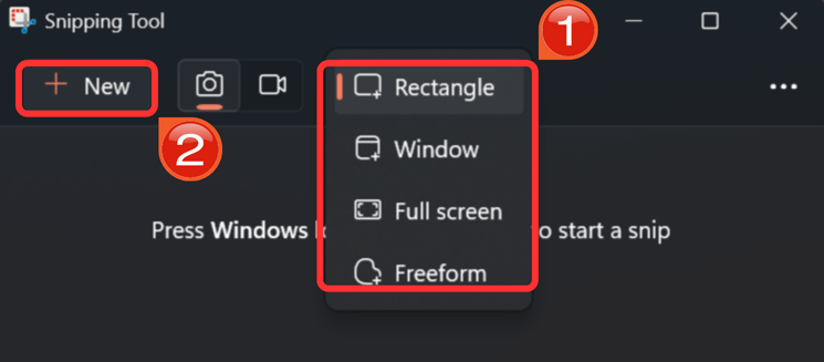 Step 2: Choose the type of snip you want to make. You can select a free-form snip, rectangular snip, window snip, or full-screen snip. Then Click "New”.