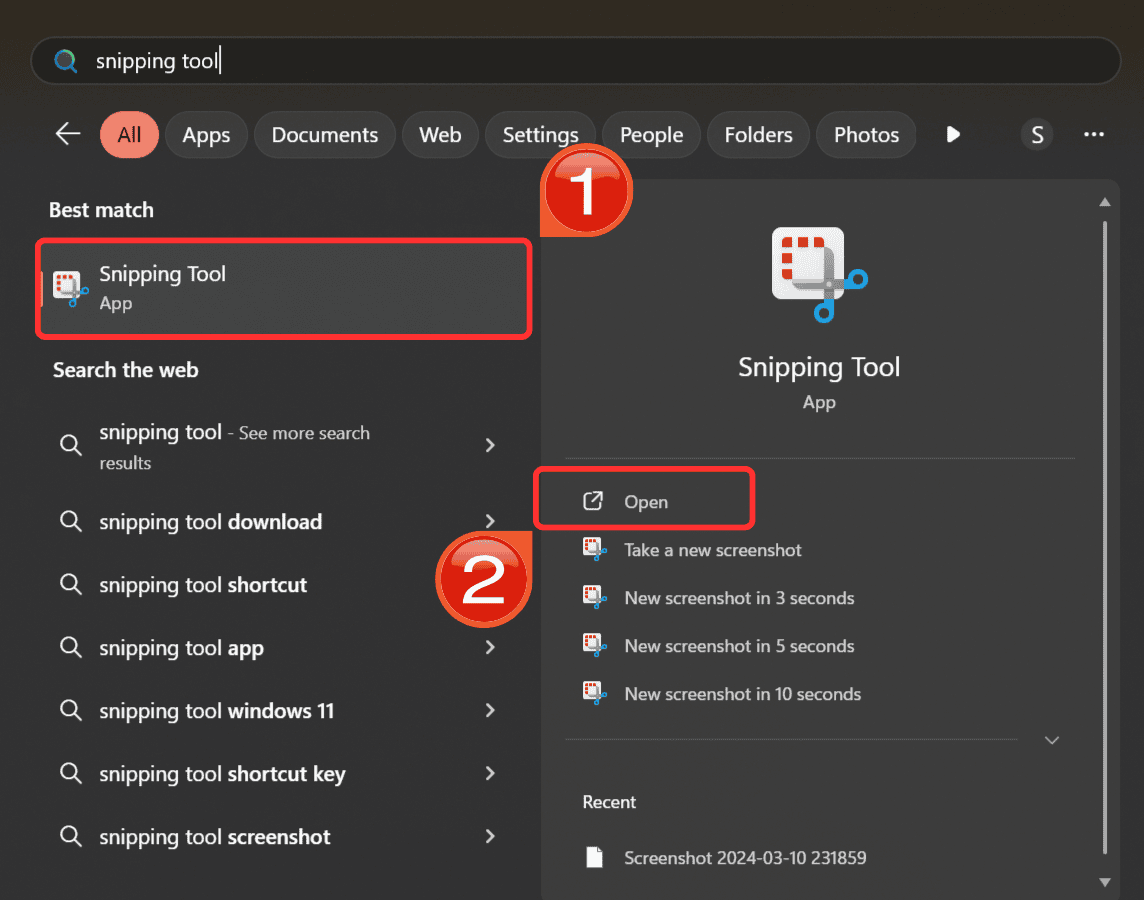 Step 1: Search for the Snipping Tool in the Start menu and click on it.