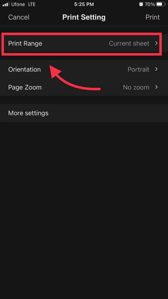 Step 7: In the Print settings screen, change the Print range field to set the print area. Click on the "Print Range" field.