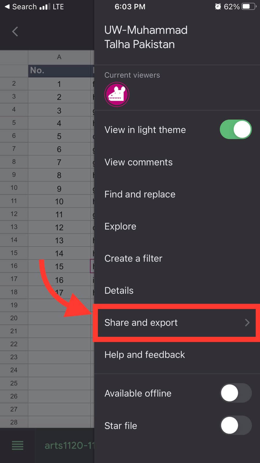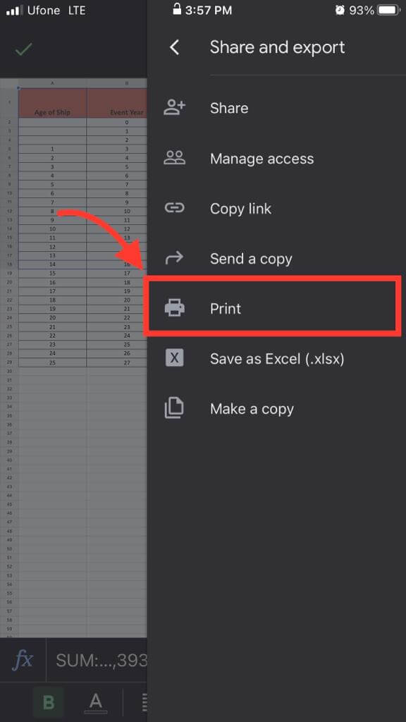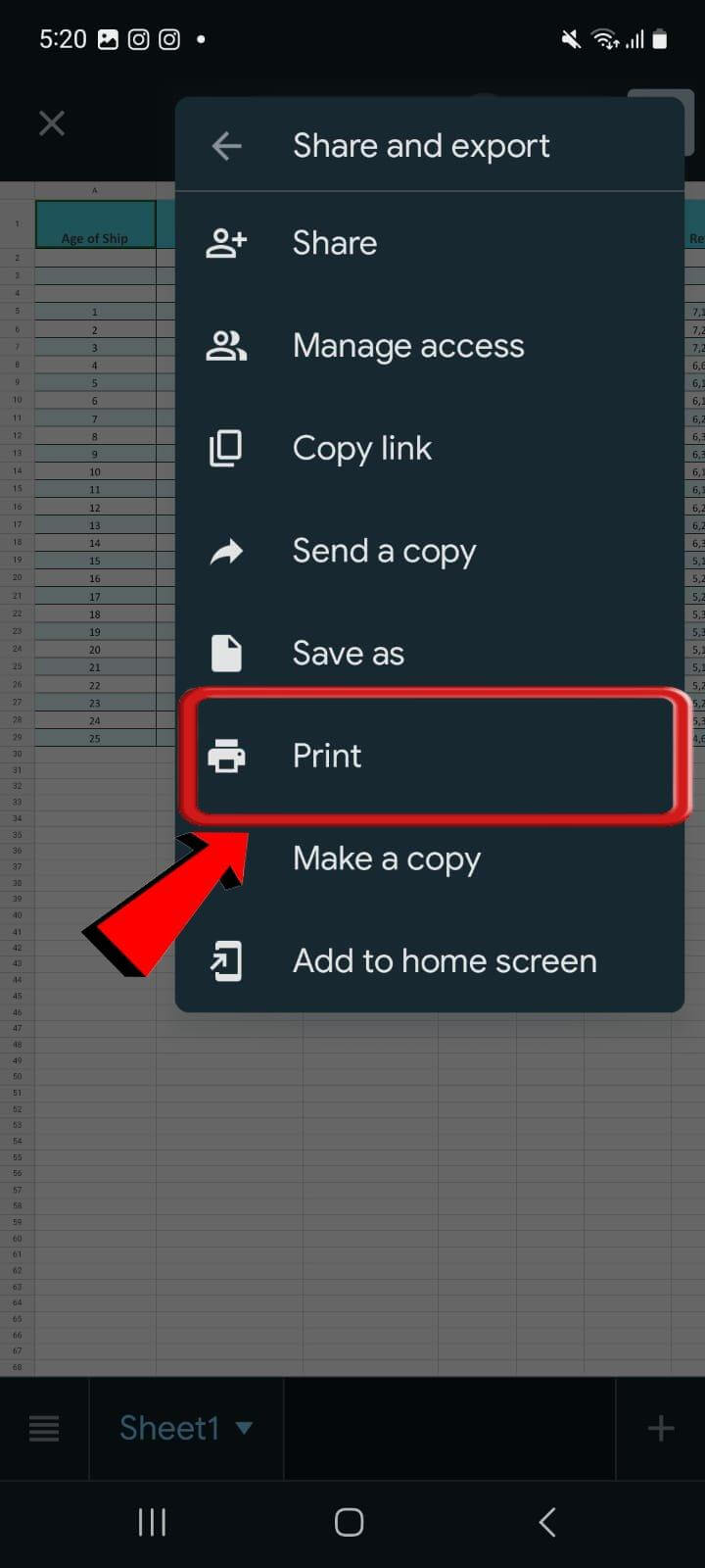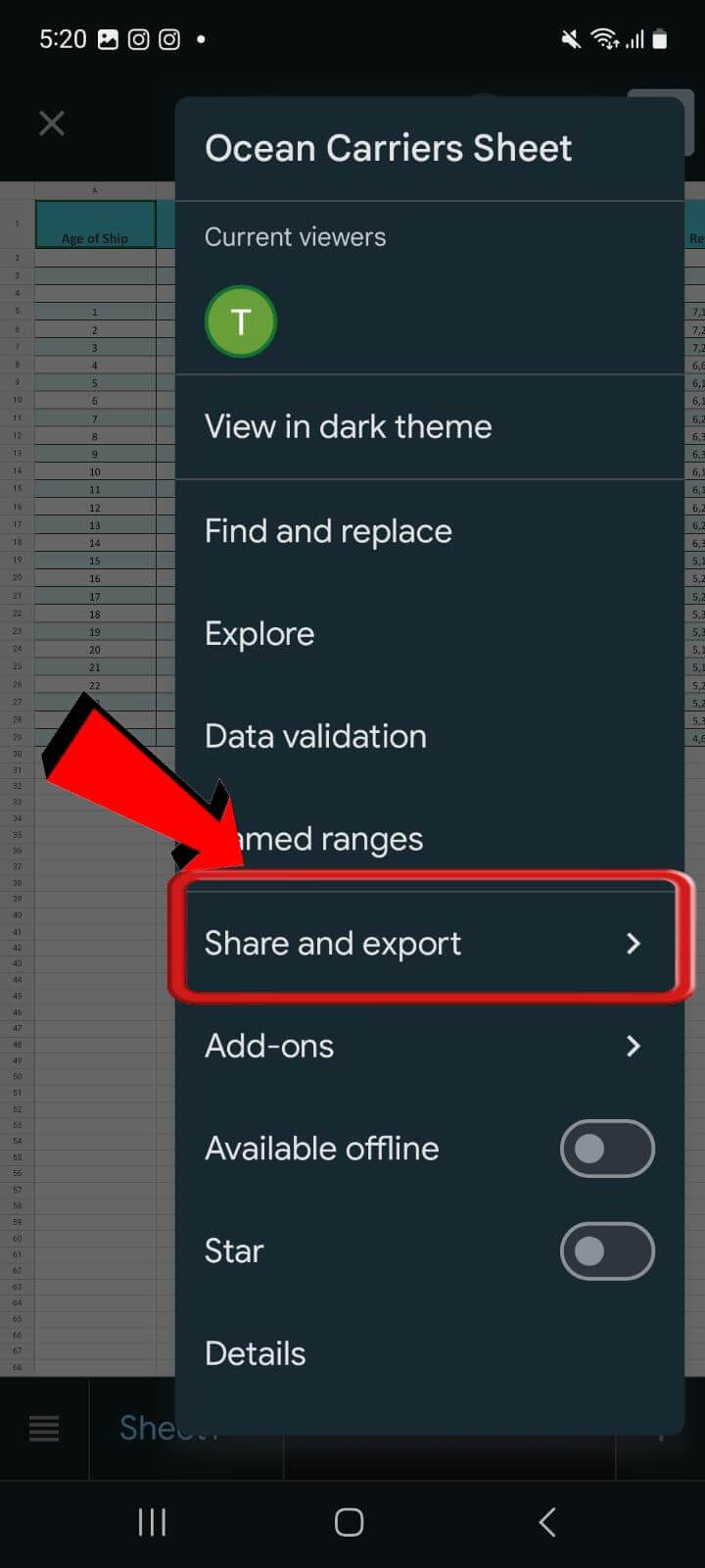 Step 3: Since printing involves sharing a hard copy of your sheets, select "Share and Export" to access the print option.