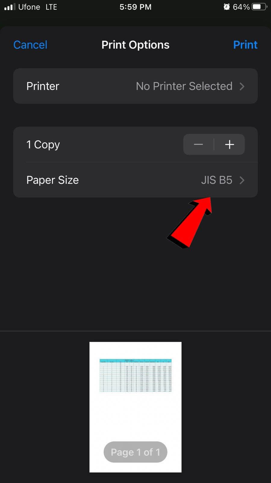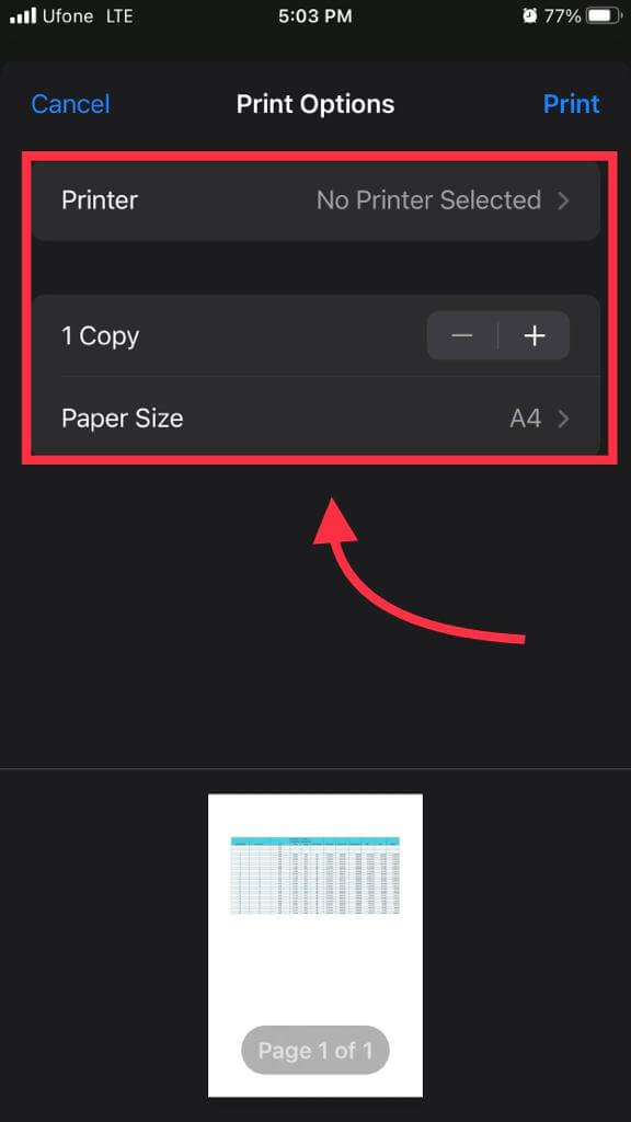 Step 6: To set a bigger print area in Google Sheets on iOS, choose a paper size. Note that options are limited on iOS.