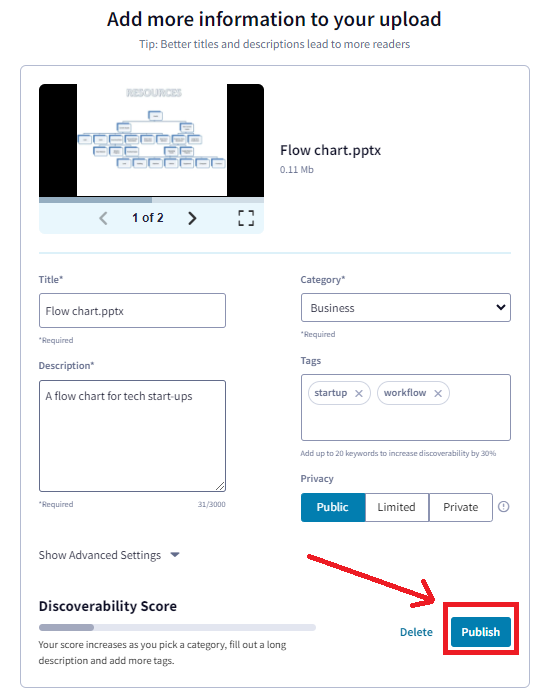 Step 3: Next, you need to fill in the details of your presentation, such as the title, description, tags, category, and privacy settings. You can also add a thumbnail image and a transcript if you want. Then, click on “Publish” to upload your presentation to SlideShare.