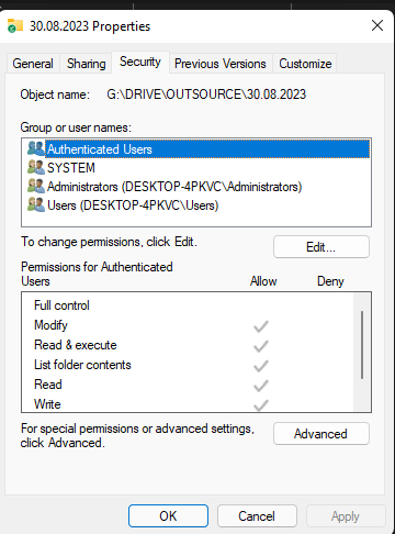 Step 3: Ensure your user account has full control over the folder. If not, add your account and grant full control.