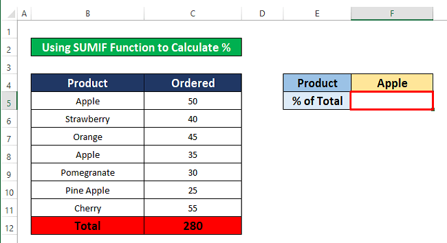 In this formula, B5:B11 is the range of cells containing the criteria (product names), F4 is the criterion itself (e.g., "Apple"), and C5:C11 is the range of cells containing the values you want to sum (order numbers).