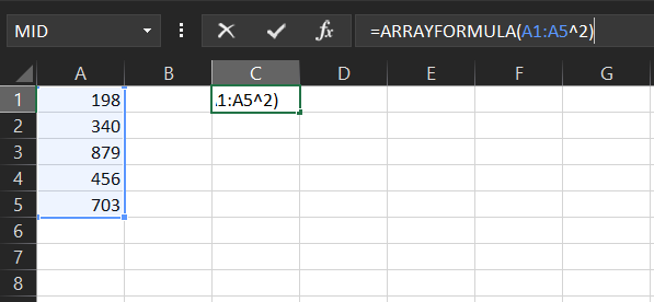 This formula takes the range A1:A5, squares each number, and returns the results as an array.