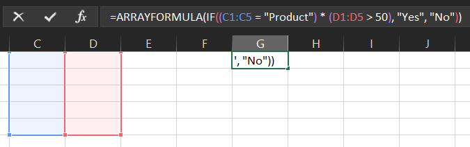 =ARRAYFORMULA(IF((C1:C5 = "Product") * (D1:D5 > 50), "Yes", "No"))