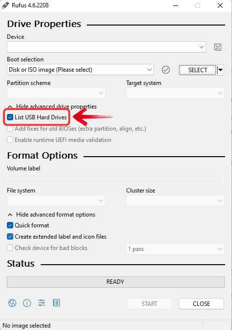 Stap 5: Aangezien we een externe USB of SSD gebruiken voor de installatie, klikt u op "Geavanceerde schijfeigenschappen weergeven" en vinkt u "Lijst USB-harde schijven" aan als uw schijf niet wordt weergegeven.