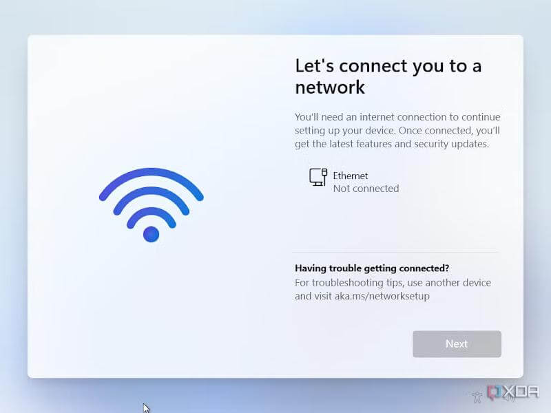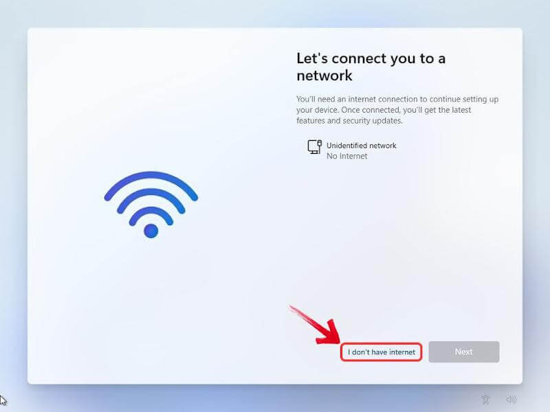 Tip: Als je de optie 'Ik heb geen internet' niet ziet, probeer dan de verbinding met ethernet te verbreken en wifi uit te schakelen via je BIOS of je router tijdelijk uit te schakelen.