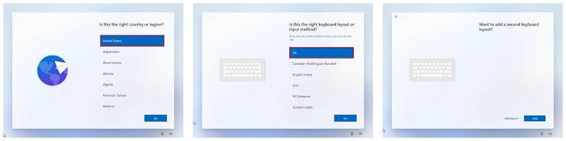 Stap 1: Begin zoals gewoonlijk met het installeren van Windows 11. Doorloop de schermen voor taal-, regio- en toetsenbordselectie.