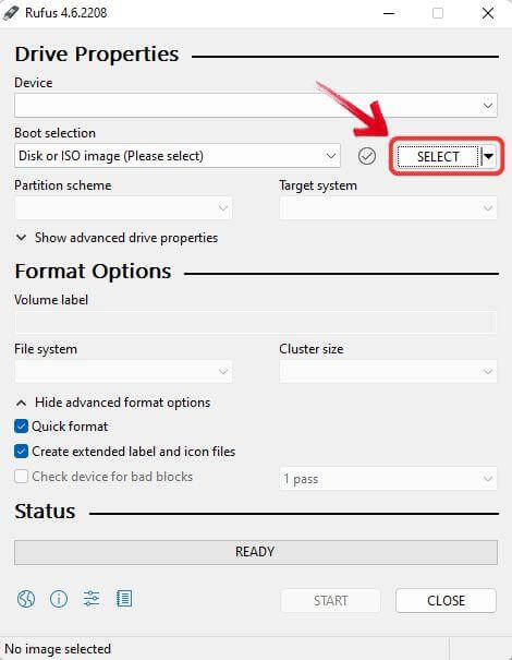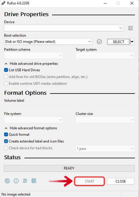 Stap 6: Klik nu op "Start". U hoeft zich geen zorgen te maken over de meeste andere instellingen, aangezien Rufus deze automatisch regelt.