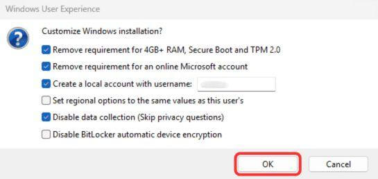 Stap 8: Voordat u op "OK" klikt, bekijkt u de andere beschikbare opties. U kunt een lokale accountnaam instellen en het verzamelen van gegevens uitschakelen; Handig als je je zorgen maakt over je privacy.