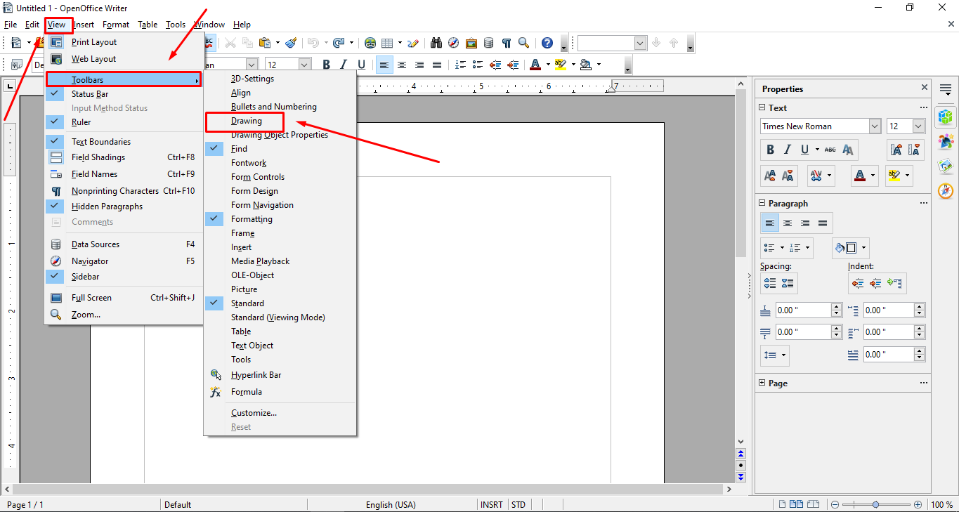 Open a new document in OpenOffice and click on the View button. Then click on Toolbars and click on Drawing.