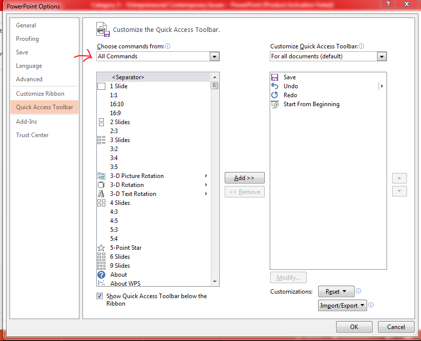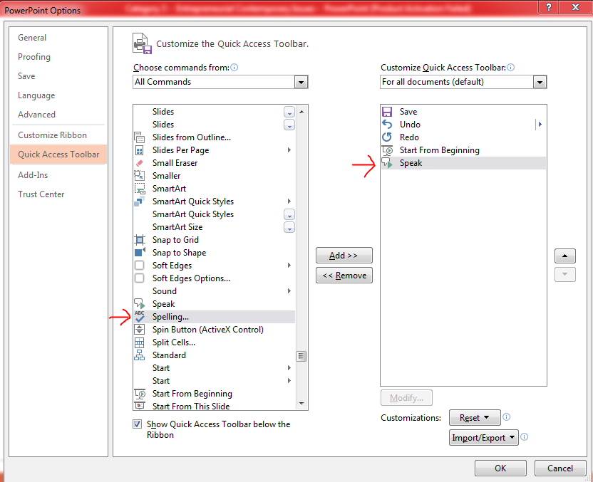 Step 3: In the "Word Options" window that opens, from the left drop-down menu, choose "All Commands." Scroll down the list until you find the "Speak" command. Click on it, then click the "Add" button to move it to the list on the right.