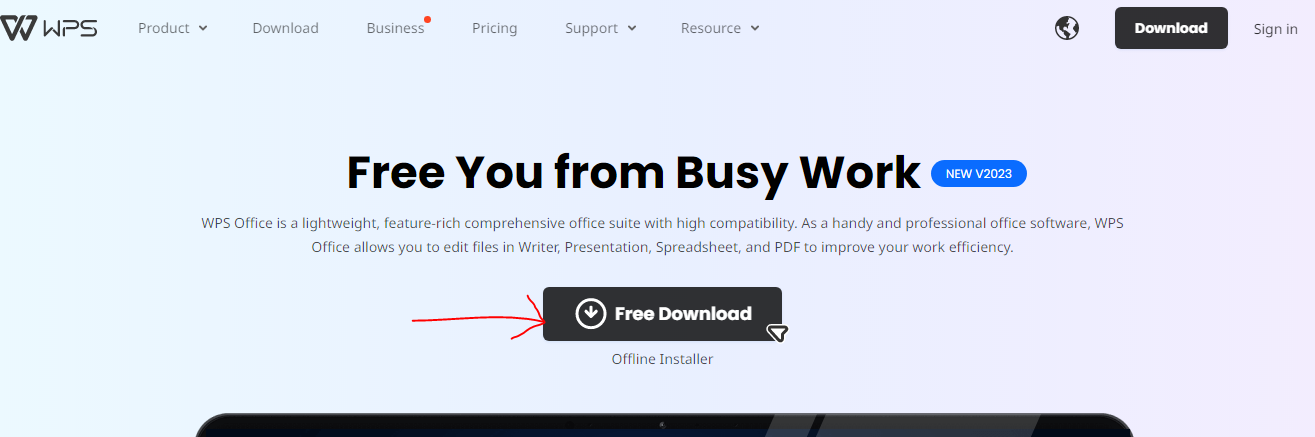 Step 2: Once on the main page, you will be greeted by a clean interface showcasing the various WPS Office products. Look for a conspicuous download button, often labeled as "Free Download" or a similar call to action.