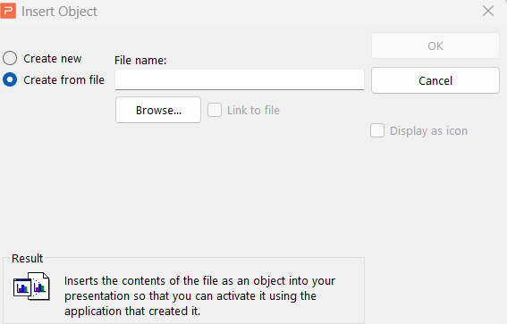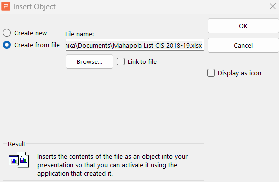 5. In the Object dialog box, select the "Link to file" option if you want any changes made to the original Excel file to be reflected in the presentation. If you do not want the file to be updated, select the "Display as icon" option.