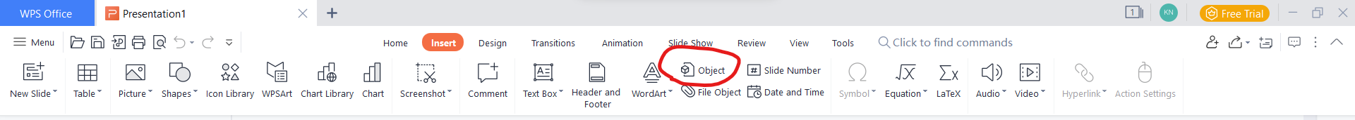 2. Click on the Insert tab in the top menu and then click on the Object button.