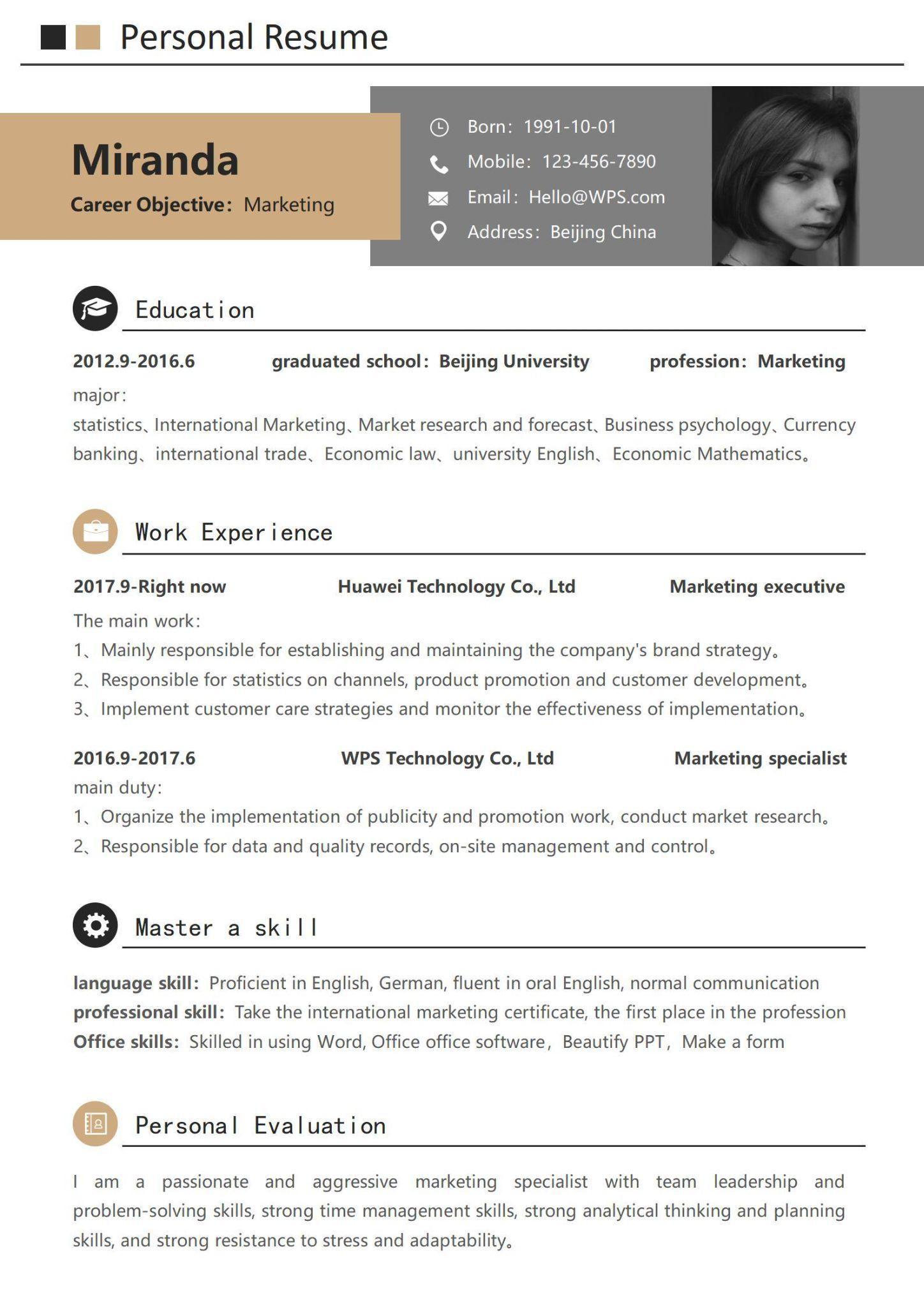 WPS Office has your interests at heart. They have multiple resources you can use to nail a winning resume for modeling in under five minutes. Their platform is easy to navigate, and they have plenty of ready-to-use templates. All you have to do is freeze the boring stuff and add relevant information. And you can share your one-page resume online or download it if you like.