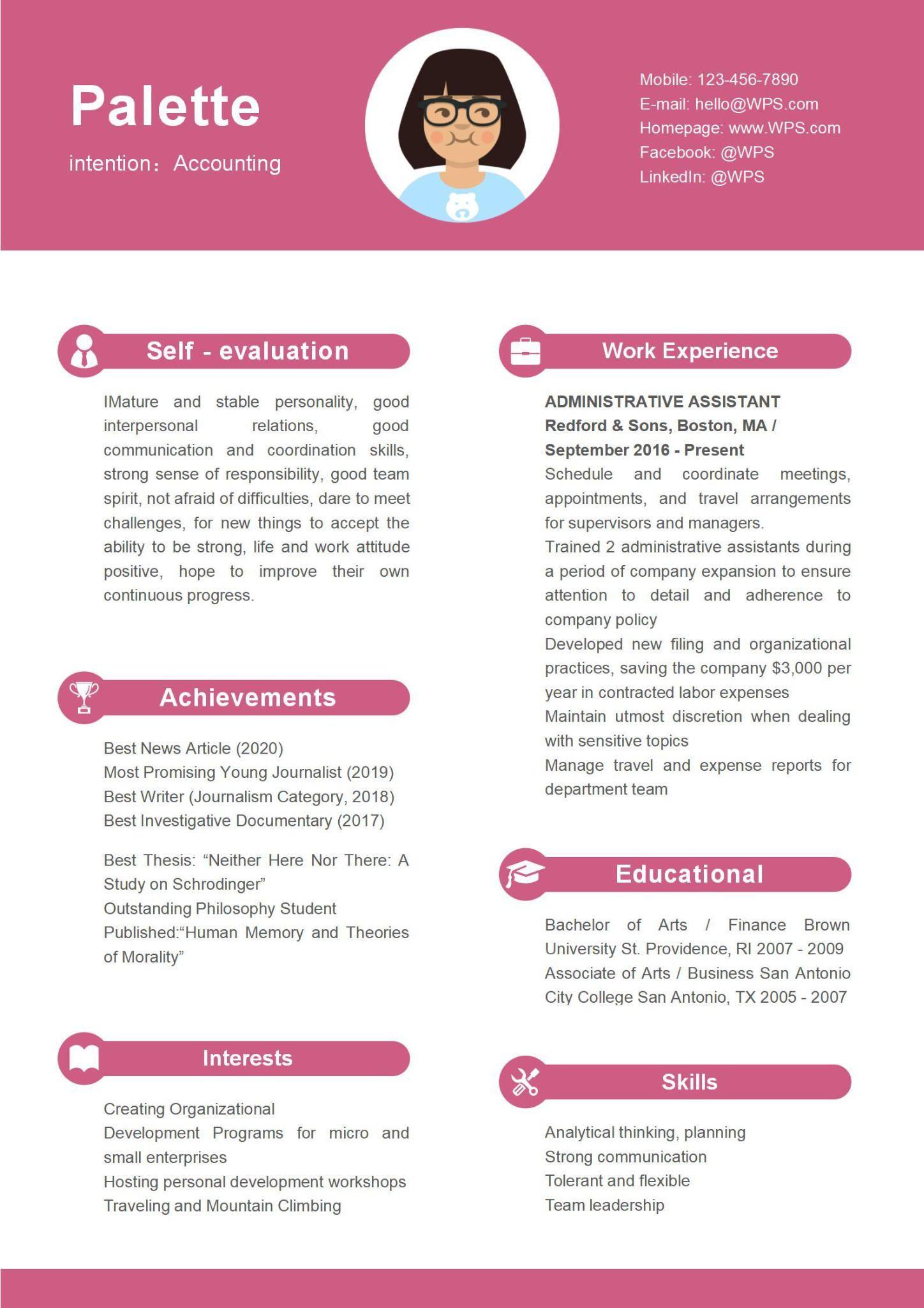 A simple pink resume template is the epitome of creativity. It uses the power of color to allow the reader to navigate the resume easily. And to tone down the headings, it applies small icons to draw attention.