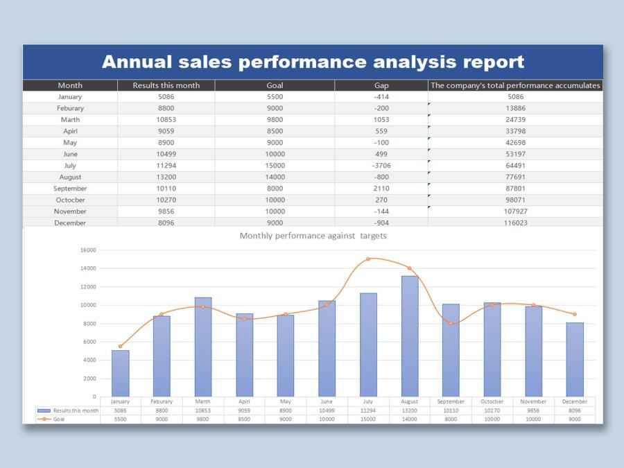 The Annual Sales Performance Analysis Report tracks monthly sales against goals, showing the gap between actual and target results. It also displays cumulative performance and provides a chart for a visual overview, helping you spot trends and adjust strategies.