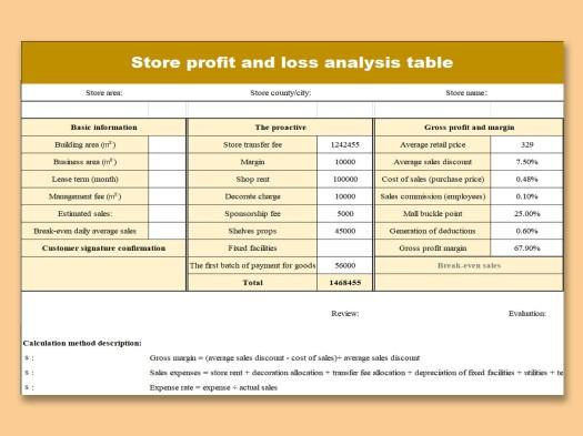 The Store Profit and Loss Analysis Table template helps businesses assess profitability by comparing key financial metrics like gross profit margin, sales discounts, and break-even sales.