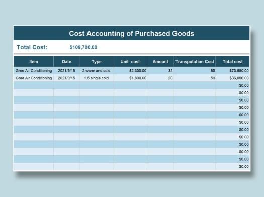 The Blue Excel for Cost Accounting template is perfect for tracking the total cost of goods you’ve purchased. It breaks down the unit cost, quantity, and transportation costs, then calculates the total cost for each item.