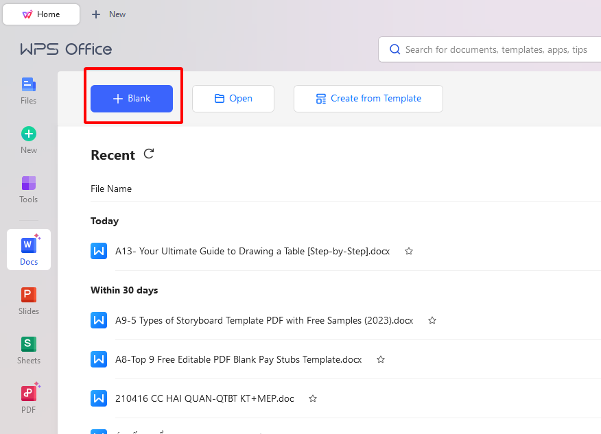 Step 3. Create a new document: Open a new document in WPS Office, or import an existing document that contains tables.