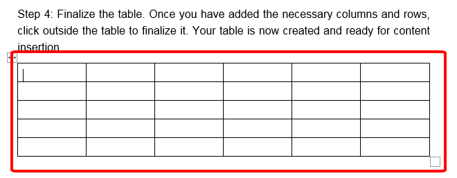 Step 4: Finalize the table. Once you have added the necessary columns and rows, click outside the table to finalize it. Your table is now created and ready for content insertion.